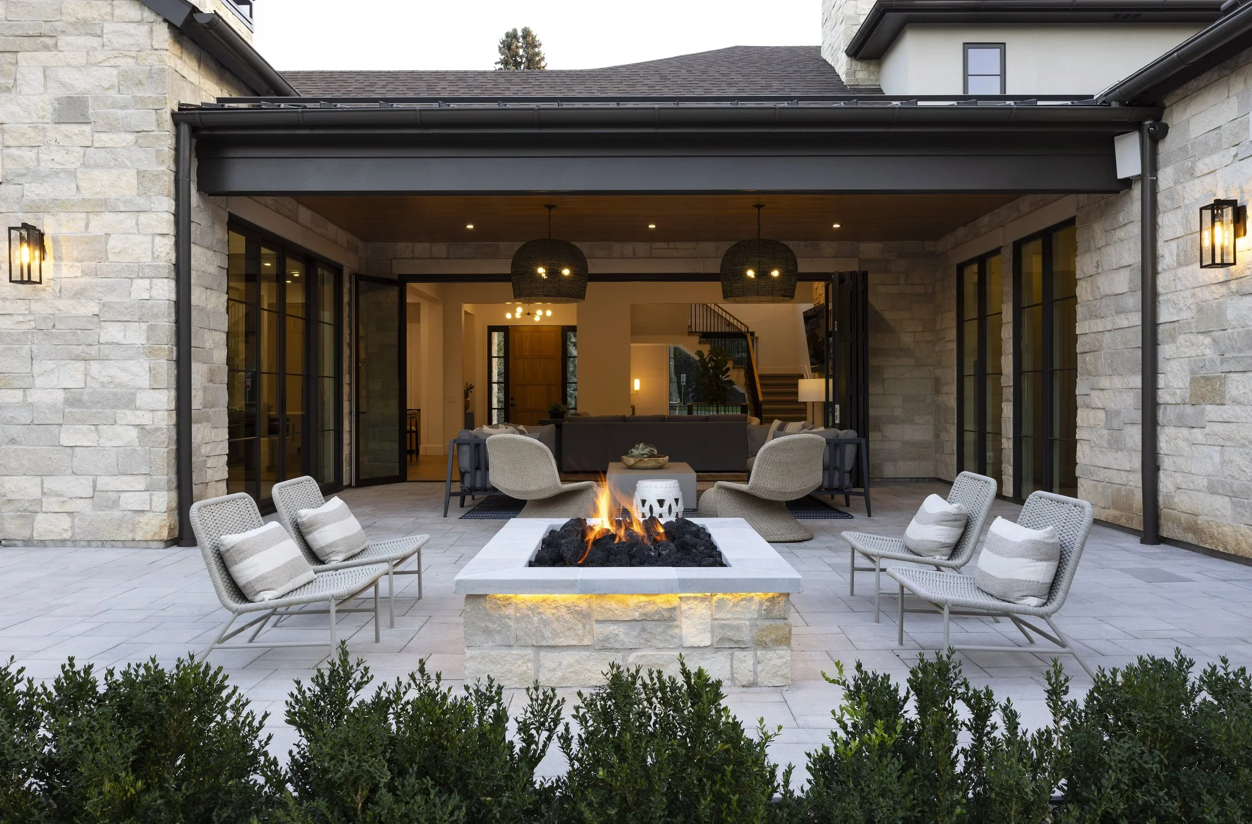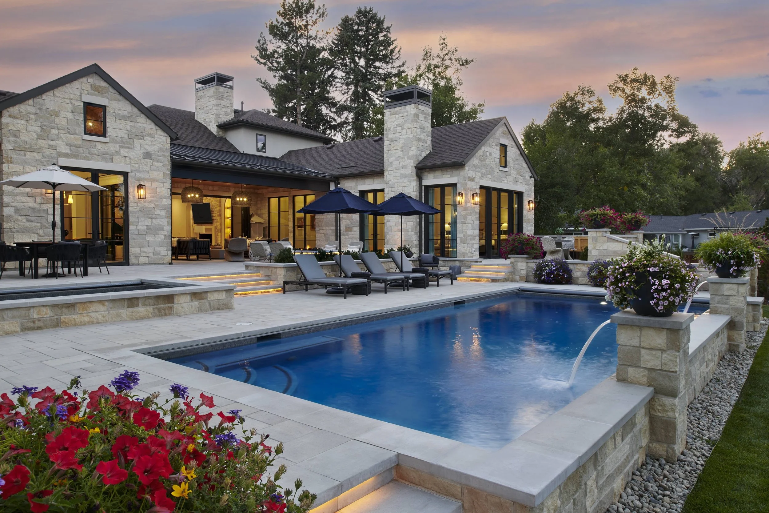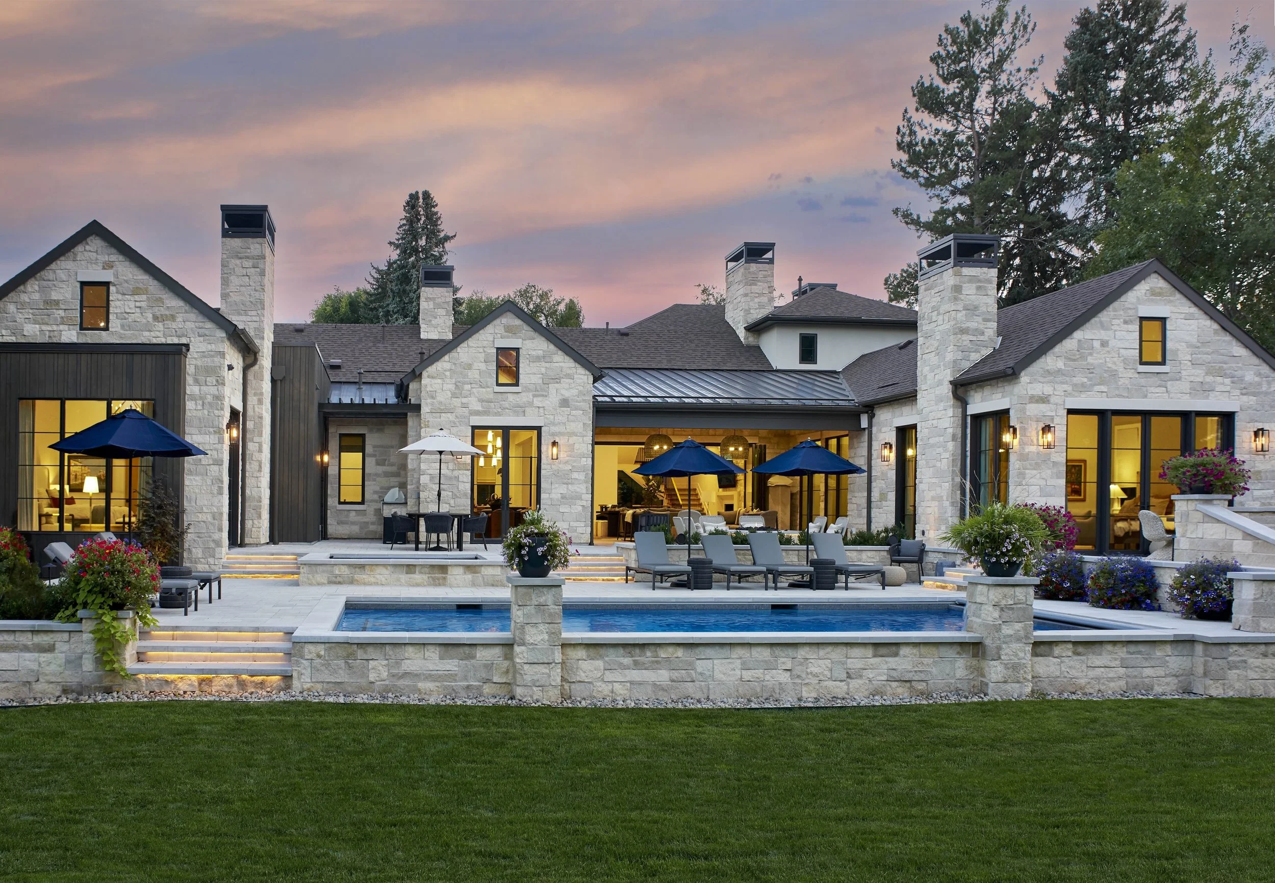 Once we created this “blank slate” for the concept, we pivoted to developing a structured spatial hierarchy: a large-format paver patio with stone retaining walls and layered accent lighting; a pool and elevated spa; a custom outdoor kitchen with an adjacent dining area and fireplace lounge; and an open lawn for sports and family play time. Low-maintenance, climate-specific plantings were chosen to promote color and movement throughout the year, while the installation of an automated irrigation system helped to support their longevity in Denver’s driest months. The completed project lives like a private club with elegant stonework, water features and cross-generational amenities that offer endless hours of connection and relaxation.